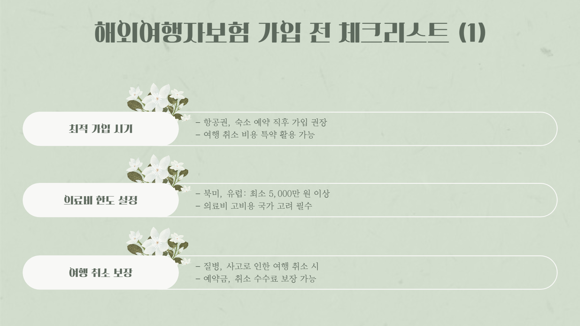 - 의료비 한도는 여행지(특히 북미·유럽)에 맞춰 5,000 만 원 이상으로 설정한다.