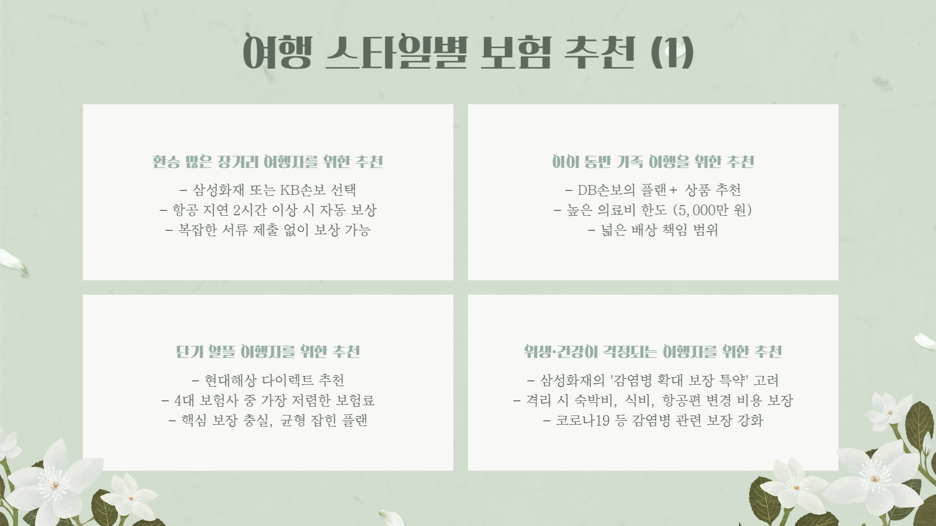| 가족·어린이 동반 | DB손보 플랜+ | 최고 수준의 의료비·배상 책임 한도, 가족 특화 |