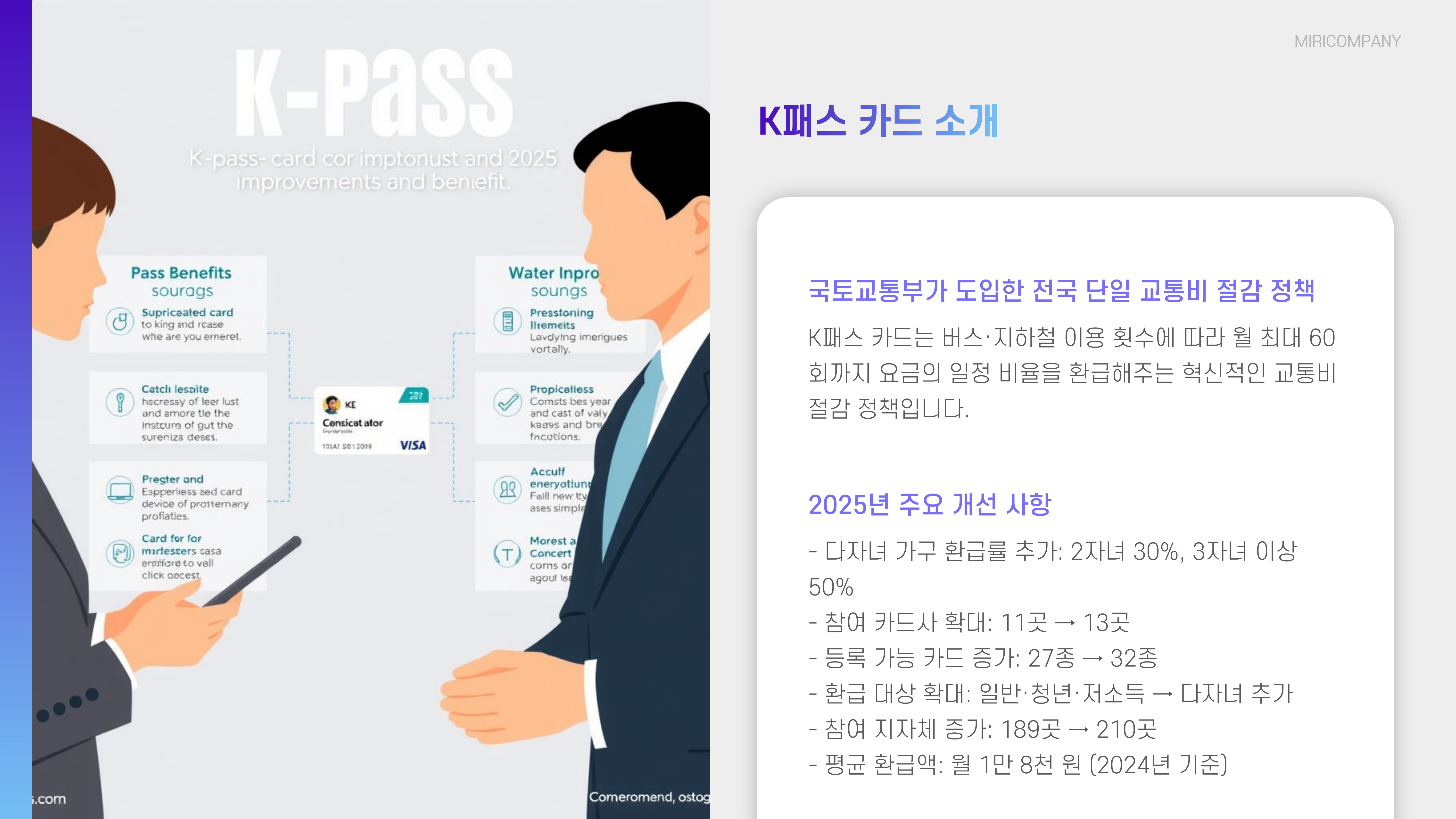 국토교통부가 2023년 도입한 K패스 카드는 버스·지하철을 ‘횟수’ 기준으로 계산해 월 최대 60회까지 이용 요금의 일정 비율을 환급해 주는 전국 단일 교통비 절감 정책입니다. 2025년 1월부터 다자녀 가구 환급률 추가·참여 카드사 확대(11→13곳) 등 제도가 대폭 개선되며 이용 가치가 더욱 커졌습니다.
